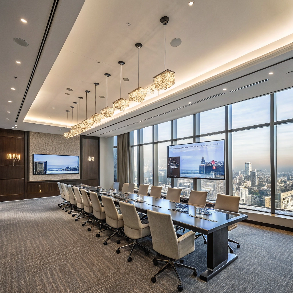 An empty conference room equipped with high-tech screens and elegant design for important meetings