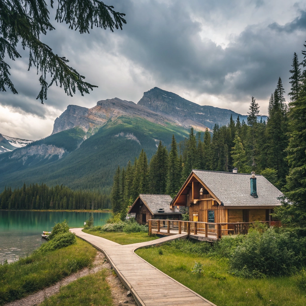 An idyllic mountain retreat with scenic views, a lake, and wooden cabins.