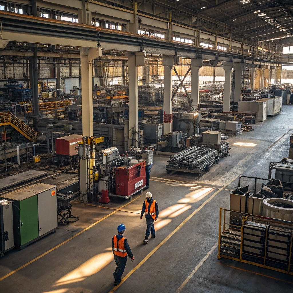 An industrial warehouse filled with machinery, emphasizing the intricate details of manufacturing.