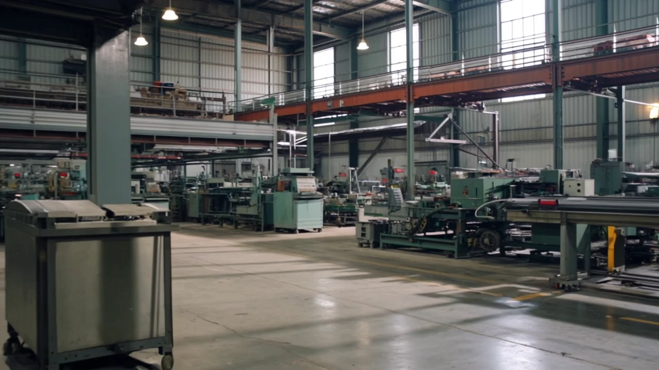 An industrial warehouse filled with machinery, emphasizing the intricate details of manufacturing.