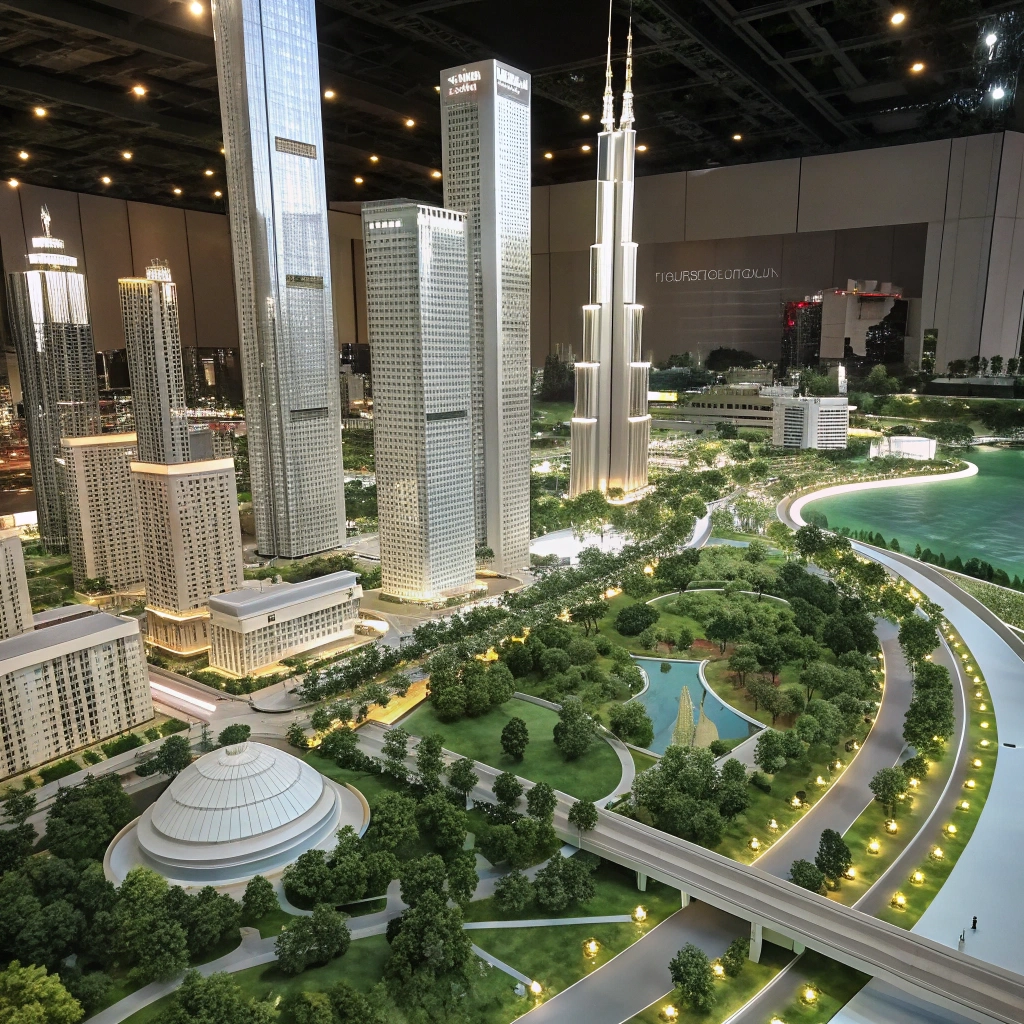 An intricate architectural model of a futuristic city with sleek designs and green spaces
