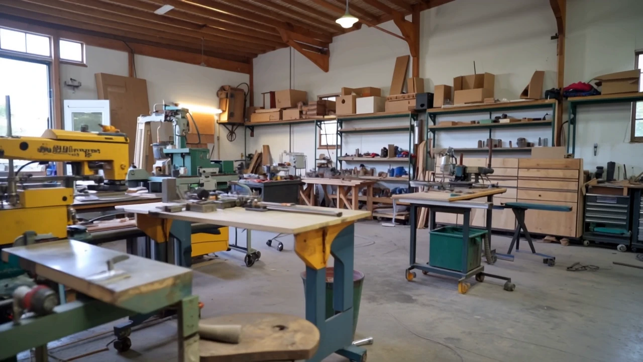 An open workshop filled with tools and crafts, highlighting the creative process in manufacturing.