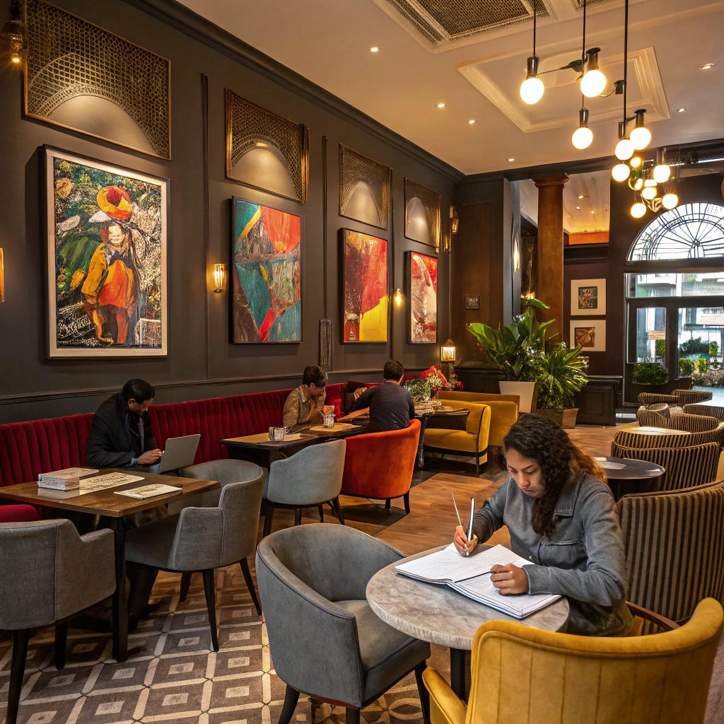 An upscale cafe interior featuring stylish furniture, artistic elements, and a vibrant ambiance for creativity