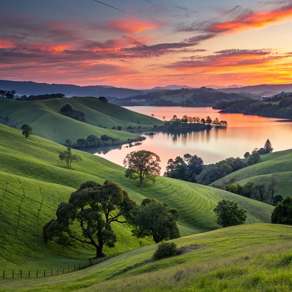 Serene landscape with rolling hills and a vibrant sunset over a tranquil lake.